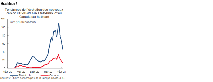 Les États-Unis ont quasiment quadruplé le nombre de cas de COVID-19 par habitant du Canada (graphique 7). On pourrait croire que le Canada a donc dû appliquer moins de mesures de relance que les États-Unis. Par contre, le Canada a ployé non seulement sous le poids de la hausse des cas, mais aussi sous les effets indirects qui ont pesé sur le reste du monde et sous les répercussions produites sur l’économie du Canada dans les réseaux du commerce et des produits de base. Or, si l’économie du Canada s’est d’abord repliée plus rapidement que celles des États-Unis, elle a aussi rebondi plus vite au S2 de 2020. Les économies ont un peu divergé au T1 : le Canada fait plus vigoureusement appel aux restrictions que les États-Unis, ce qui devrait être transitoire. Si les risques paraissent transitoires, l’étape suivante consiste à évaluer l’ampleur des mesures de relance dans le contexte de ce choc et à le faire en chiffres relatifs.