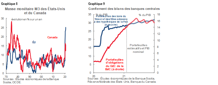 Les taux de croissance de la masse monétaire globale fracassent les records de plusieurs dizaines d’années dans les deux pays (graphique 8). À la différence de la crise financière mondiale, l’essor fulgurant des bilans des banques centrales (graphique 9) n’est pas contré par la destruction généralisée des ressources monétaires parallèles en raison de la crise du crédit. S’il s’agit vraiment d’un choc transitoire, marqué par un très mauvais trimestre pour le PIB l’an dernier dans les deux pays, ce type d’expansion soutenue de la politique monétaire est extraordinairement ambitieux. Accompagnés de la reprise attendue, portée par le PIB, de la vitesse de la masse monétaire en circulation (ou du taux de rotation de la masse monétaire, qui est faible à l’heure actuelle), les effets sur l’inflation pourraient être considérables et s’infléchir plus rapidement qu’auparavant. Dans les annales, il n’y a jamais eu de période comme celle-ci, que l’on pourrait modéliser dans l’échantillon sous la forme des conséquences inflationnistes, parce que nous n’avons jamais connu de périodes au cours desquelles les bilans des banques centrales ont été gonflés aussi fortement, sans que s’exercent des forces compensatoires.
