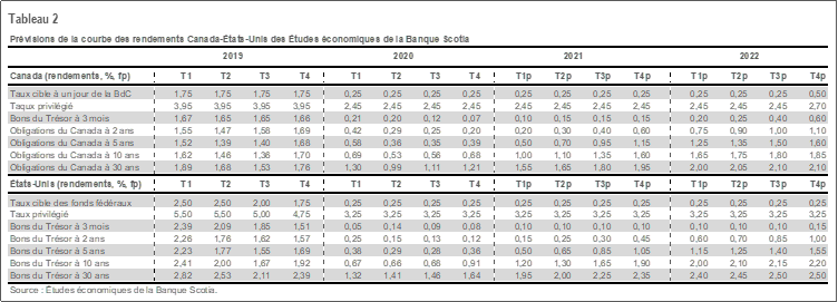 Les graphiques 1 et 2 représentent nos prévisions de la courbe des rendements pour les États-Unis et le Canada en 2020-2021. Nous prévoyons que la courbe des tendances continuera de se pentifier pendant l’essentiel en 2021; vers la fin de l’année et en 2022, elle devrait subir de vastes mouvements qui devraient l’aplanir. L’on s’attend à ce que les mises en courte durée cèdent la place à un parti pris pour une plus longue durée dans l’évolution de l’horizon prévisionnel. Veuillez consulter le tableau 2 de l’annexe pour prendre connaissance des prévisions de la courbe des rendements des deux pays.