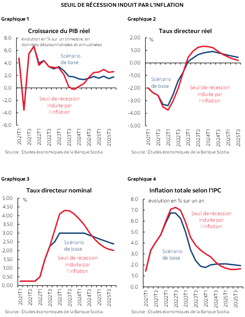 D’après le Modèle macroéconomique mondial de la Banque Scotia, nous estimons qu’un choc chronique supplémentaire de l’ordre de 1 % de l’inflation déclencherait une récession dans le deuxième semestre de 2023.