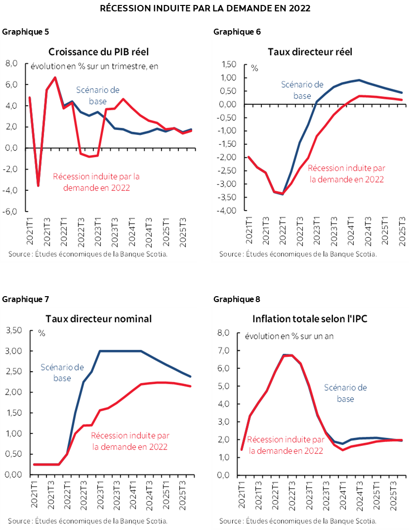 Une récession en 2022, causée par les faits nouveaux imprévisibles dans l’évolution du conflit opposant la Russie et l’Ukraine, percuterait les taux directeurs. Il s’agirait alors d’un scénario stagflationniste : la hausse des cours des produits de base et la multiplication des contraintes de la chaîne logistique en raison de la guerre donneraient lieu à une légère récession dans le deuxième semestre cette année. Cette récession est appelée à être modérée, en raison de l’exposition limitée du Canada à la guerre et de son statut d’exportateur net de produits de base, qui profite de la hausse des cours des produits de base.