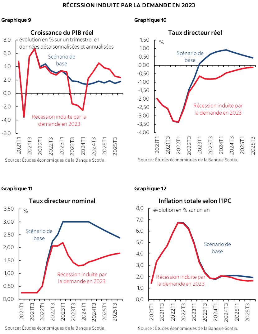 En reprenant le même choc sur la demande, nous calibrons une récession en 2023. Cette récession est plus profonde que celle évoquée dans la section précédente, puisque notre scénario de croissance de base en 2023 est plus faible que celui de 2022. Les graphiques 9 à 12 font état de l’impact produit sur nos profils de taux directeurs. Les résultats indiquent que les taux devraient continuer d’augmenter aujourd’hui pour enrayer les pressions inflationnistes, mais un peu moins ambitieusement. Dans ce scénario, les taux s’établissent à 2 % à la fin de 2022, avant de plonger en 2023. C’est pourquoi, même si la banque centrale s’attendait l’an prochain à une récession de la demande, les pressions inflationnistes sont trop invasives pour justifier la décision d’abandonner le durcissement monétaire.