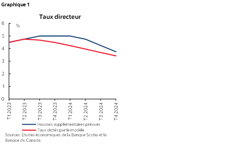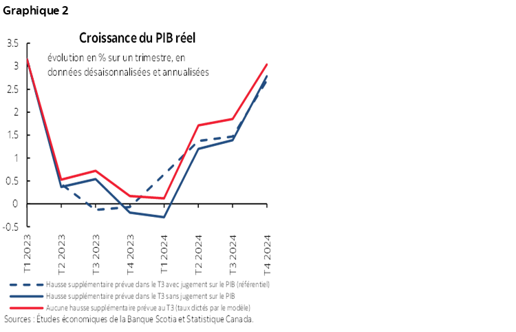Le graphique 2 trace les parcours qui en découlent pour l’activité économique dans chaque scénario. En plus de prévoir une hausse supplémentaire, notre scénario référentiel du 16 juin (ligne en traitillé bleue) intègre un autre jugement porté sur la croissance du PIB qui cadre avec les données de plus grande fréquence et les récents développements, ce qui donne deux trimestres consécutifs de croissance négative dans le deuxième semestre cette année — soit une légère récession technique. En supprimant ce jugement supplémentaire sur le PIB et en maintenant le parcours prévu pour les taux d’intérêt, on obtient quand même une récession (ligne pleine bleue) qui est légèrement plus profonde et qui intervient un trimestre après notre scénario référentiel du 16 juin. Nous comparons ce scénario à un autre scénario qui prévoit que le modèle déterminera les taux sans superpositions de notre part (ligne pleine rouge). Comme l’indique le graphique 2, en mettant fin au cycle de hausses des taux au niveau actuel pour le taux directeur, on permettrait à l’économie d’éviter une récession d’ici la fin de l’année. Autrement dit, la récession que nous projetons dans nos prévisions référentielles est le résultat du durcissement de la politique monétaire, plutôt que de la conjoncture économique sous‑jacente, ce qui donnerait une perte de 0,5 % du PIB.