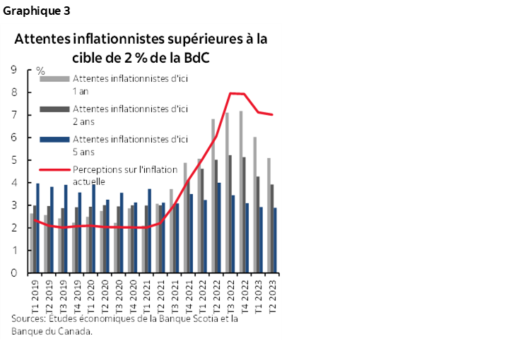 Or, ce résultat en apparence souhaitable, selon lequel la Banque du Canada ne rehausse pas les taux cette année et selon lequel notre économie évite une récession avec un coût relativement moindre pour l’inflation, se fonde sur nos hypothèses référentielles d’un ralentissement de l’inflation dans les prochains trimestres. Il ne tient pas compte des surprises à la hausse dans les perspectives de l’inflation. Ces surprises potentielles constituent un motif d’inquiétude monétaire dramatiquement supérieur à celui des surprises à la baisse de l’inflation compte tenu du niveau actuel et du niveau projeté de l’inflation par rapport à la cible de la BdC et de l’écart entre les attentes inflationnistes et la cible (graphique 3). Si l’inflation s’accélère, la BdC risque une baisse de sa crédibilité et le désancrage des attentes inflationnistes, ce qui obligera à pratiquer plus de hausses que ce que prévoit actuellement notre pronostic référentiel pour assurer le ralentissement nécessaire et ramener l’inflation sur la cible. D’après nos simulations, une autre baisse importante de la crédibilité voudrait dire que le taux directeur pourrait culminer à plus de 5,5 % contre 5,0 % dans notre scénario référentiel et que le taux directeur à la fin de 2024 serait de plus de 4,5 %, et non de 3,75 %. Les coûts seraient ainsi démesurés pour les ménages, qui devraient composer non seulement avec la hausse des prix, mais aussi avec l’augmentation de la dette à rembourser et du moindre accès au nouveau crédit pour financer l’accroissement de ces dépenses, ce qui aurait des retombées négatives sur l’ensemble de l’économie.