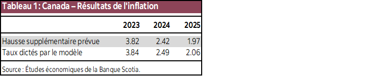 La résilience de l’économie canadienne à la hausse des taux d’intérêt dans la dernière année fait ressortir clairement la nécessité de hausser légèrement les taux directeurs pour ralentir obligatoirement l’inflation et la ramener sur sa cible de 2 %. C’est ce que l’on constate dans la décision de la Banque du Canada de hausser son taux directeur en juin en laissant la porte ouverte à d’autres hausses éventuelles. Effectivement, nous croyons que la Banque du Canada haussera une dernière fois les taux d’intérêt au troisième trimestre. Bien que notre modèle n’indique pas que cette nouvelle hausse soit nécessaire, malgré la résilience de l’économie et l’inflation fondamentale récalcitrante, nous considérons qu’il s’agit d’une assurance contre l’inflation.