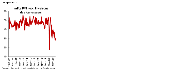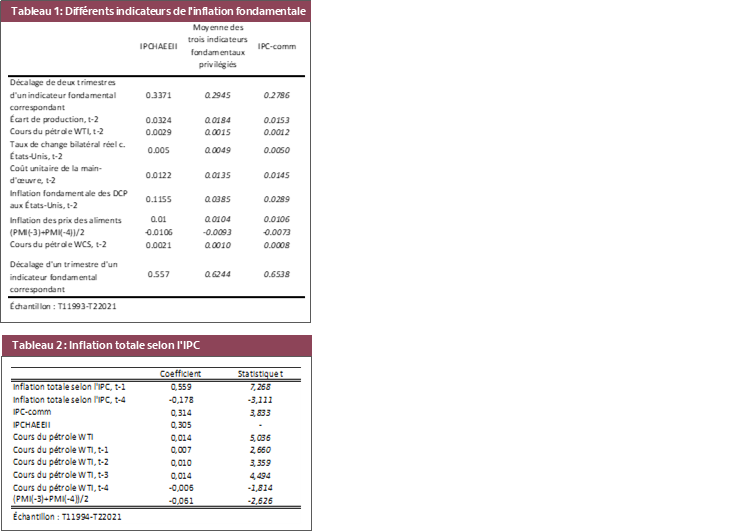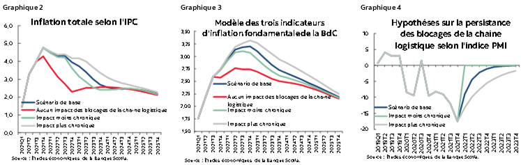 On n’avait pas vu, dans les décennies qui ont précédé le début de la pandémie de COVID-19, de blocages de la chaîne logistique de l’envergure de ceux que nous avons connus en 2020-2021; c’est pourquoi les méthodologies existantes qui servent à prévoir l’inflation au Canada et aux États-Unis ont essentiellement exclu cette piste. Pour le Canada, notre approche existante dans la modélisation de l’inflation fait appel à une relation modifiée de la courbe de Phillips entre les baromètres de l’inflation fondamentale sur un an et un ensemble de facteurs économiques. Entre autres, cette approche tient déjà compte du niveau de la capacité de rechange dans l’économie (l’écart de production), ainsi que de la hausse des coûts de main-d’œuvre dans le contexte des pénuries de travailleurs. Par contre, cette approche ne tient pas compte, à l’heure actuelle, des indicateurs des blocages de la chaîne logistique, qui ont haussé les coûts des intrants distincts de la main-d’œuvre ou qui ont freiné d’emblée l’activité manufacturière et la vente au détail dans différents secteurs d’activité au Canada — faute de fournitures.