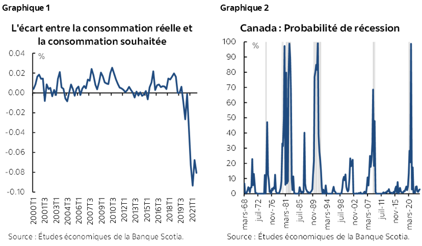 Dans le contexte canadien, il faut aussi noter que la situation financière des ménages reste étonnamment solide. Les liquidités sont exceptionnellement élevées, le ratio d'endettement par rapport aux actifs frôle les creux atteints depuis 20 ans, et la richesse — et surtout sa répartition parmi les quintiles de revenus — laisse entendre que les ménages seront en mesure d’encaisser les hausses de taux à venir. De plus, la demande refoulée des ménages atteint des niveaux sans précédent dans les annales statistiques (graphique 1), ce qui réduira probablement, au moins temporairement, l’impact de l’inflation et des taux d’intérêt sur les décisions des consommateurs. Il va de soi que la hausse des taux d’intérêt et de l’inflation réduira l’activité économique; toutefois, les fondamentaux économiques sous‑jacents restent très bien orientés, ce qui devrait apaiser certaines craintes selon lesquelles la hausse des taux nous fera basculer dans une récession. En fait, notre modèle de probabilité récessionniste continue de pointer un très faible risque de récession sur les quatre prochains trimestres (graphique 2). Ceci dit, nous prévoyons un ralentissement de la croissance, qui sera inférieure à 2 % dans le deuxième semestre de 2023; il s’agit d’un rythme de croissance qui cadre essentiellement avec notre estimation du potentiel.