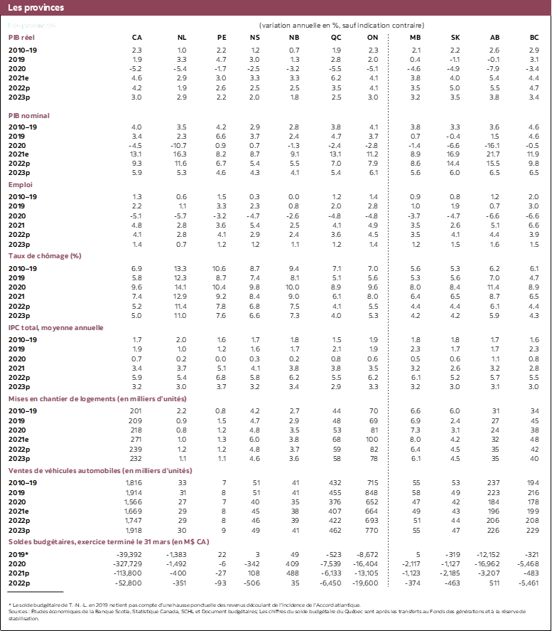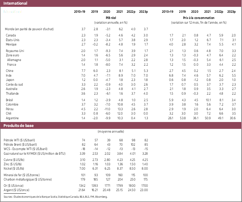 Si les données qui viennent d’être publiées continuent de laisser entendre que l’économie canadienne est très vigoureuse, le choc de l’attaque russe contre l’Ukraine donne lieu, en Europe, à des révisions négatives importantes. Il faut probablement s’attendre à une récession dans certains pays en raison de l’impact de la guerre sur les prix des intrants, ce qui ne paraît toutefois pas probable pour les pays exportateurs de produits de base. À notre avis, il paraît prématuré de parler d’une récession mondiale; or, même s’il y en avait une, ses répercussions sur le Canada en particulier seraient considérablement amorties par la solidité de notre balance commerciale.