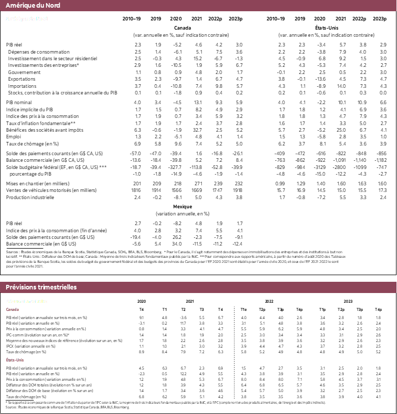 C’est pourquoi nous continuons de croire qu’aux États‑Unis comme au Canada, les décideurs enchaîneront avec une révocation rapide des mesures de relance. Dans ces deux pays, nous nous attendons à des taux directeurs de 3 % à pareille date l’an prochain. Il faut probablement s’attendre, d’ici à ce que cette prévision se matérialise, à quelques hausses de 50 points de base. Pour le Canada, puisque nous avons établi des prévisions à long terme, nous croyons que la première hausse de 50 points de base sera annoncée le 13 avril. Aux États‑Unis, nous nous attendons à une hausse de 50 points de base à la réunion du FOMC en mai. Si l’évolution des taux directeurs nominaux s’annonce vigoureuse selon les normes statistiques en raison de son rythme, le point terminal des taux par rapport aux taux directeurs neutres ne sera pas très élevé historiquement. Dans la perspective des taux directeurs réels, on s’attend à des taux réels négatifs jusqu’au début de l’an prochain. C’est pourquoi il est préférable de parler de révocation des mesures de relance, plutôt que d’un durcissement de la politique monétaire. Même si cet argument peut paraître trop sémantique, il est important de savoir que malgré un durcissement rapide, la politique monétaire resterait probablement conciliante dans les deux pays pour une grande partie de l’an prochain.