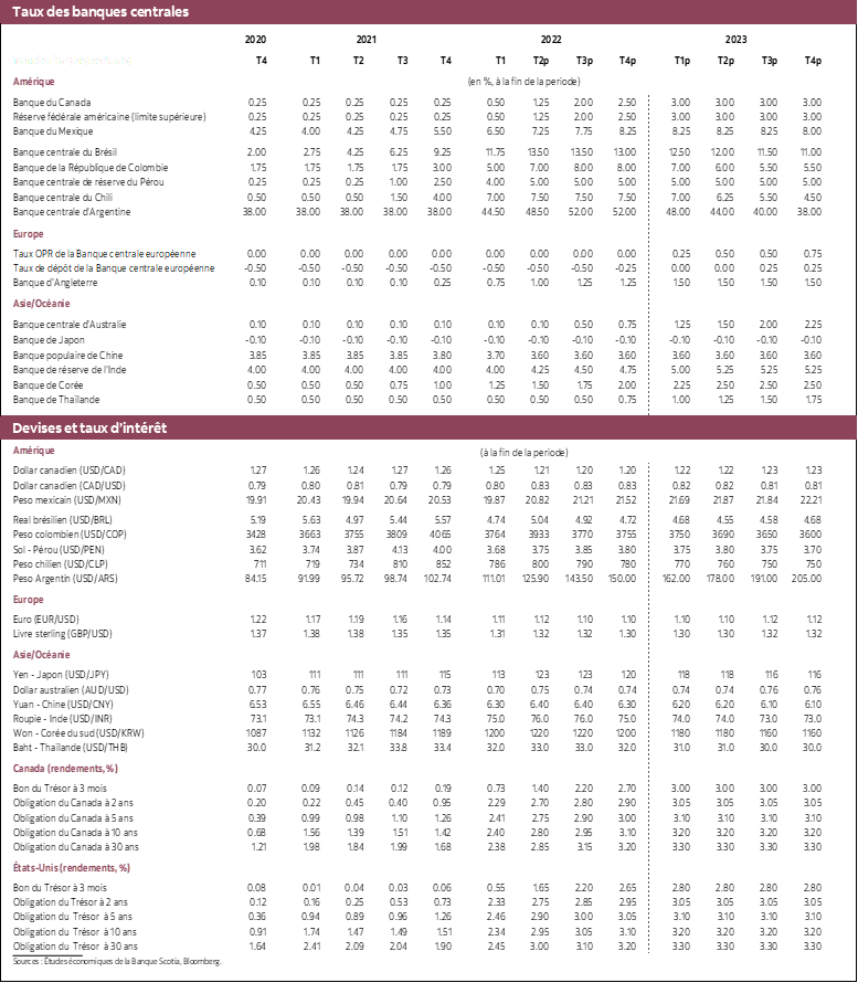 Le présent rapport a été préparé par Études économiques Scotia à l’intention des clients de la Banque Scotia. Les opinions, estimations et prévisions qui y sont reproduites sont les nôtres en date des présentes et peuvent être modifiées sans préavis. Les renseignements et opinions que renferme ce rapport sont compilés ou établis à partir de sources jugées fiables; toutefois, nous ne déclarons ni ne garantissons pas, explicitement ou implicitement, qu’ils sont exacts ou complets. La Banque Scotia ainsi que ses dirigeants, administrateurs, partenaires, employés ou sociétés affiliées n’assument aucune responsabilité, de quelque nature que ce soit, en cas de perte directe ou consécutive découlant de la consultation de ce rapport ou de son contenu.