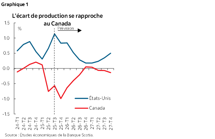 - La croissance diverge : En supposant qu’aucun de ces risques ne se matérialisera pour produire des effets considérables, la tendance laisse dans l’ensemble entrevoir à l’horizon un ralentissement de la croissance américaine. Au Canada par contre, la croissance devrait s’accélérer en 2027. Dans l’économie américaine, la demande devrait rester excédentaire, alors qu’au Canada, l’offre excédentaire devrait s’amoindrir (graphique 1).