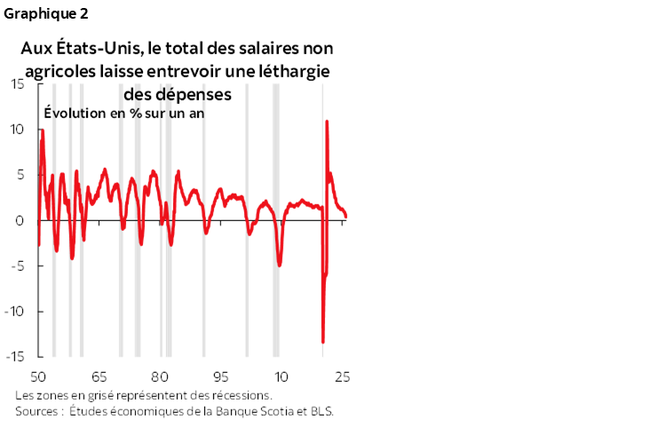 - de l’escalade des pressions politiques sur la Fed : si nous en tenons déjà compte par le truchement de ce nouvel assouplissement, une nouvelle escalade pourrait faire baisser encore plus le taux des fonds fédéraux que ce que nous supposons actuellement et risque de désarrimer les attentes inflationnistes. L’anticipation de la conjoncture récente sur les marchés a été essentiellement timorée; elle pourrait toutefois être vulnérable aux signes d’un réembrasement des pressions inflationnistes et des contraintes économiques.