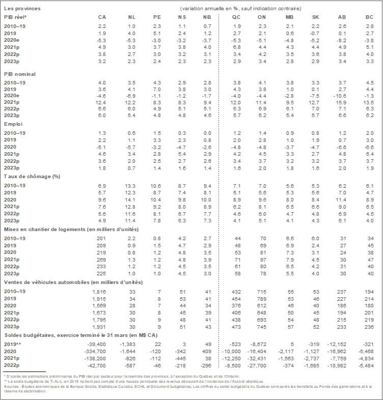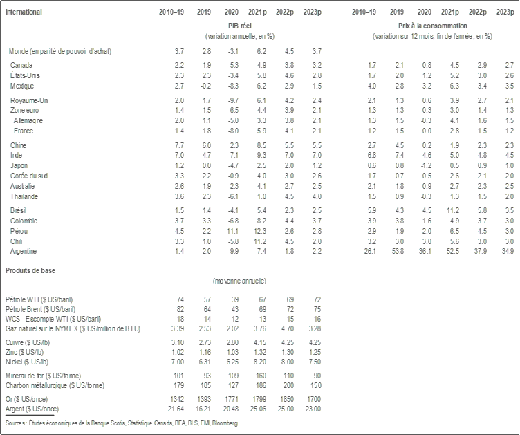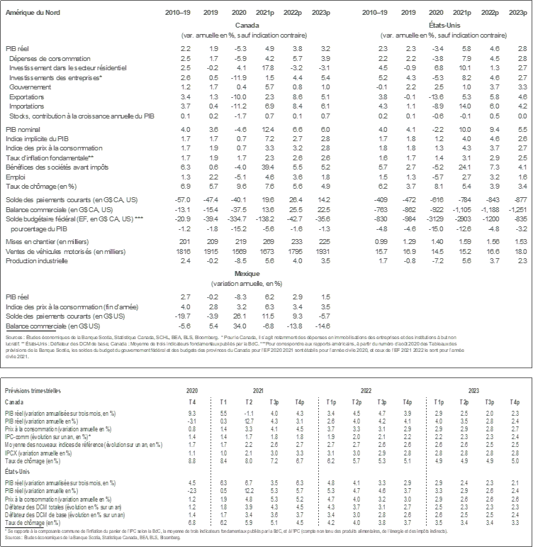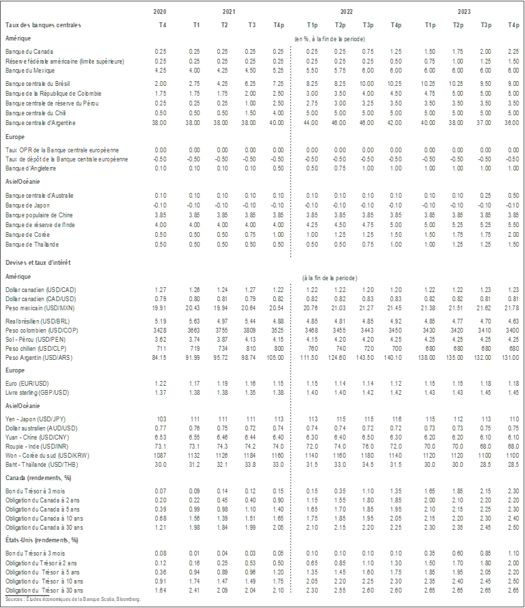La compression de l’offre qui perdure et cette ambiguïté de l’impact sur l’offre par rapport à la demande dans certains segments de la chaîne de production nous amènent à réviser à la hausse nos prévisions de l’inflation au Canada. Du point de vue des travailleurs, nous nous attendons à ce que la rémunération horaire augmente de plus de 4 % dans chacune des deux prochaines années. Cette évolution s’explique par la dynamique exceptionnelle de la situation actuelle : les pénuries de main-d’œuvre sont sans précédent dès les premières phases d’une reprise qui s’annonce toujours, selon nos prévisions, vigoureuse et durable. En outre, les prix et les loyers des logements devraient continuer d’augmenter en raison des tensions sous-jacentes du déséquilibre entre l’offre et la demande dans le marché immobilier. Ainsi, même si certaines hausses temporaires de prix induites par la chaîne logistique s’amenuisent dans les prochains mois, les autres sources d’inflation portées par les fondamentaux s’amplifieront. C’est pourquoi nous nous attendons aujourd’hui à ce que l’inflation de base au Canada s’établisse à une moyenne de 2,6 % en 2022 et en 2023.