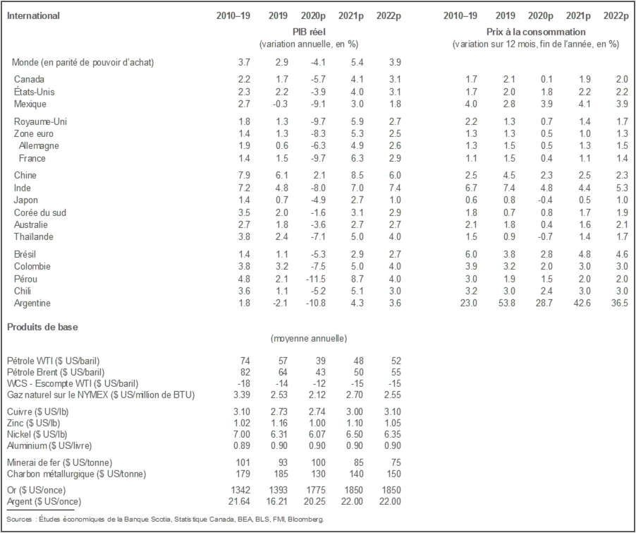 Les incidences dominantes sur les révisions apportées aux prévisions dans les dernières semaines ont à nouveau essentiellement porté sur la pandémie. D’une part, la recrudescence des cas dans bien des pays, comme on s’y attendait généralement, est un choc pour les perspectives à court terme. Même si les mesures de confinement sont généralement beaucoup plus ciblées que celles qui ont été déployées dans la première phase, ces mesures et les inquiétudes sur la propagation du virus auront pour effet de ralentir la croissance dans les prochains trimestres. D’autre part, les nouvelles dans la mise au point des vaccins sont très encourageantes, et nous prévoyons que nous pourrons triompher du virus l’an prochain. C’est ce qui a déclenché une nouvelle remontée des marchés financiers et des décisions substantielles de renchérissement du risque des portefeuilles. Dans l’ensemble, malgré les inquiétudes qui pèsent sur la situation actuelle de la pandémie, il paraît évident que nous sommes sur le point de tourner la page de la COVID-19.