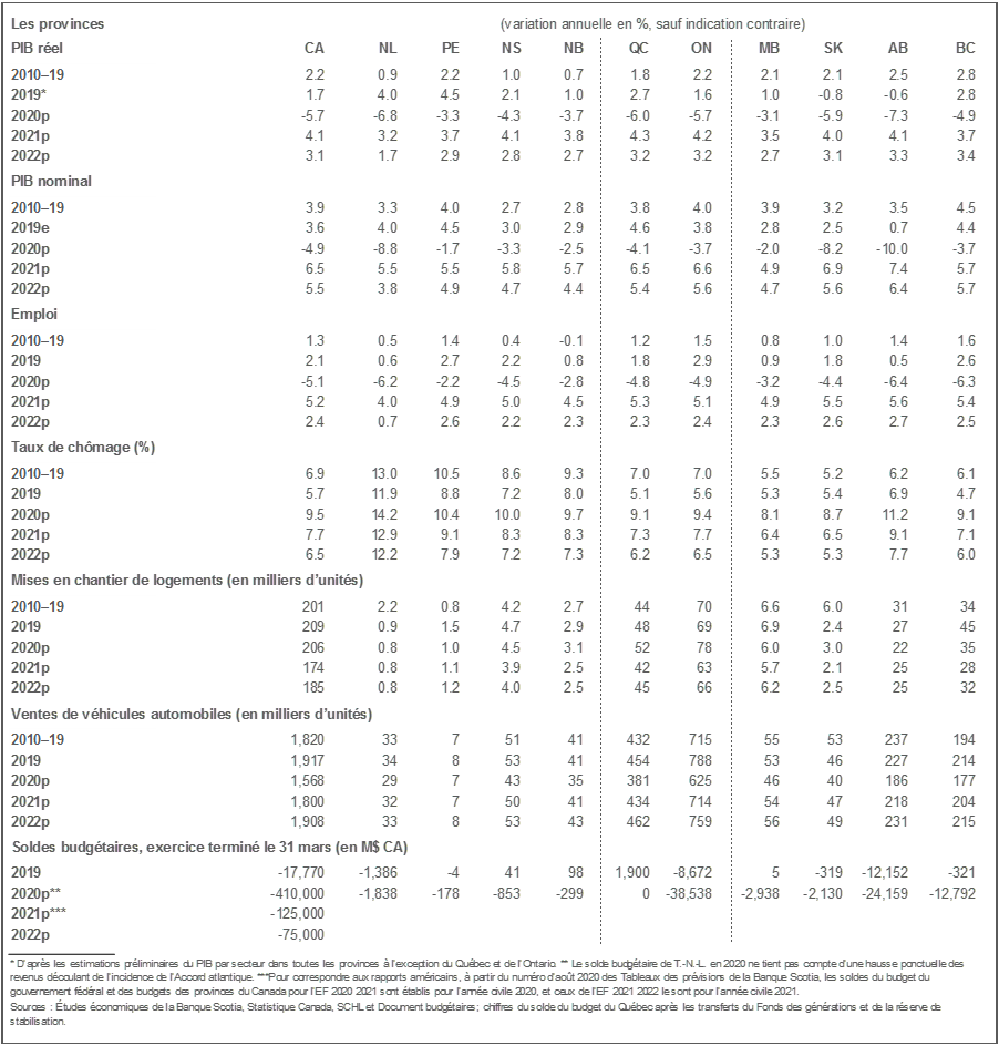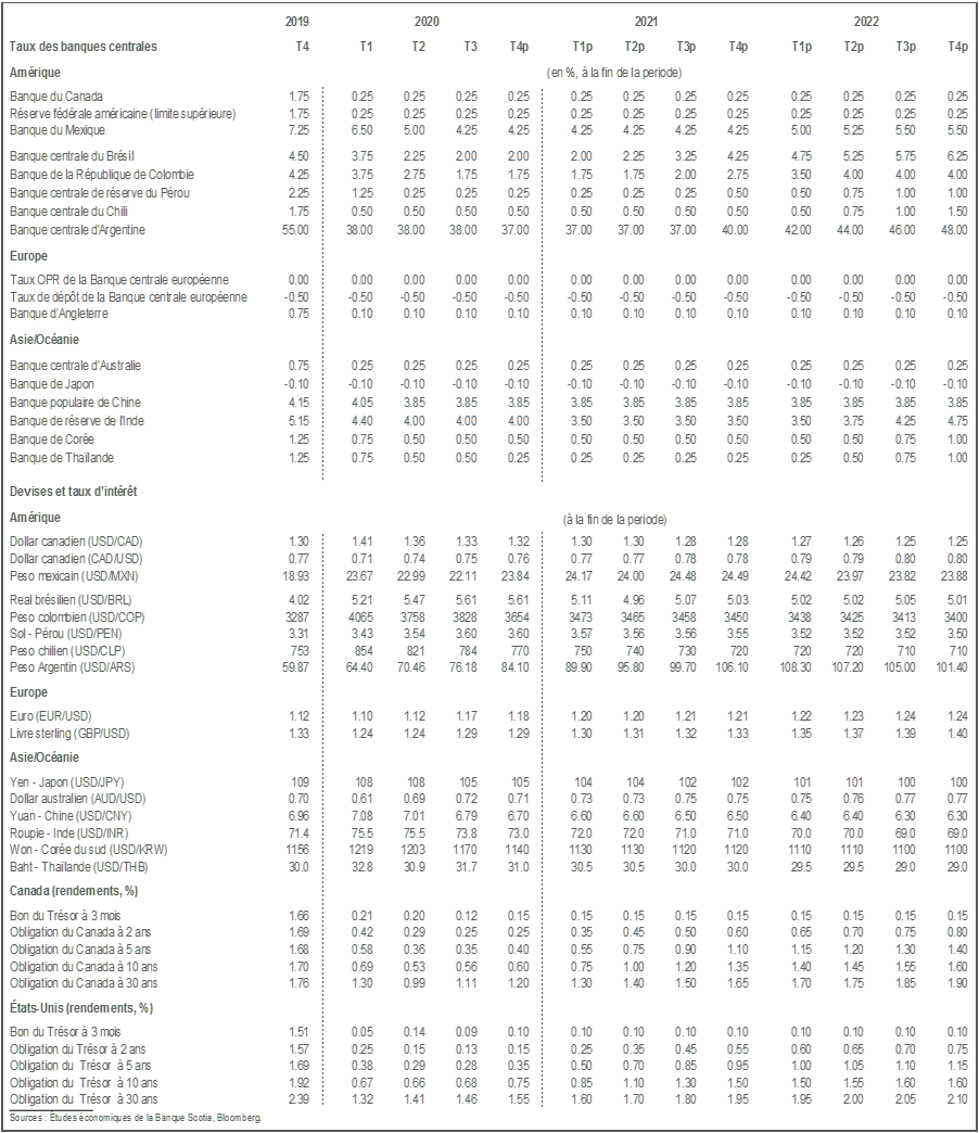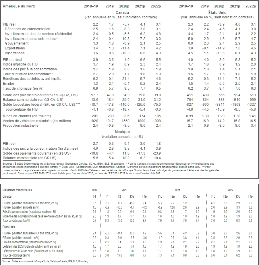 En somme, la conjoncture récente continue de laisser entendre qu’une solide reprise se déroulera l’an prochain, même si elle peut être décalée d’un trimestre par rapport aux pronostics antérieurs. Du point de vue canadien, les perspectives à court terme se sont détériorées à cause de la COVID-19; toutefois, les mesures annoncées dans l’Énoncé économique de l’automne, de concert avec le vaccin, et la vigueur des prix des logements devraient permettre à l’activité économique de rebondir considérablement au deuxième trimestre et dans les trimestres suivants. Nous nous attendons à ce que d’importantes liquidités soient injectées dans l’économie quand les Canadiens auront plus l’assurance que la pandémie sera maîtrisée et que les risques pour l’emploi et la santé s’amenuiseront. Pour la première fois depuis le début de la pandémie, les risques pour l’an prochain paraissent basculer à la hausse compte tenu du vaccin, de la possibilité que l’économie américaine se relève plus vigoureusement qu’attendu, de la possibilité d’autres mesures budgétaires dans le budget fédéral du printemps et de la vigueur soutenue du marché du logement.