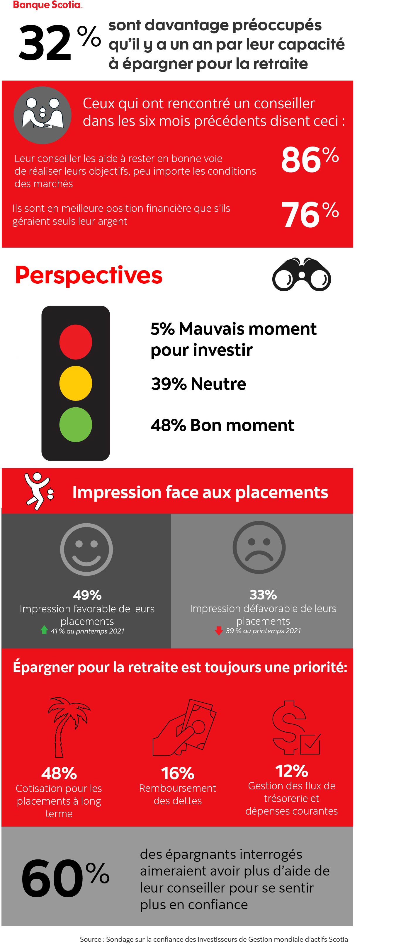 Mais 87 % de ceux qui ont rencontré un conseiller dans les six mois précédents se sentent plus en confiance et pensent que leurs placements seront suffisants, d’après le Sondage sur la confiance des investisseurs de Gestion mondiale d’actifs Scotia.