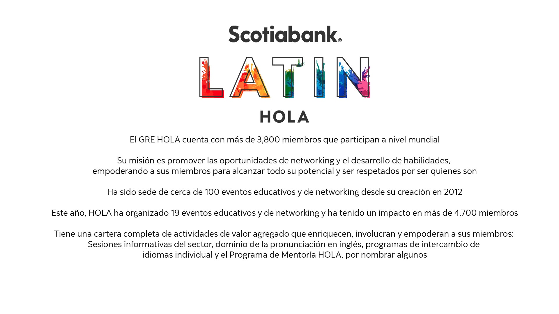 Diego: El GRE HOLA está incrustado en el ADN de esta organización, que comenzó en Canadá hace más de 10 años para representar los intereses de la comunidad de empleados hispanos y latinos. Los miembros de HOLA en Workplace casi se ha duplicado de aproximadamente 2,000 a 3,800 en un año, siendo actualmente el tercer GRE global más grande después del GRE de mujeres (4,500 miembros) y el GRE LGBT+ (9,600 miembros), con un tremendo potencial para expandirse aún más tanto en Canadá como en todos los países de Banca Internacional. Al ser el Banco Líder de las Américas, estamos comprometidos a apoyar a las comunidades y a los empleados de los países en los que servimos; por lo tanto, Latinoamérica representa una de las principales fuentes de negocios, crecimiento y empleados del Banco. El GRE HOLA ofrece una plataforma global para la creación de networking y habilidades, por medio de sus diferentes programas, que están abiertos no solo para los empleados hispanos y latinos, sino para todos los Scotiabankers en todo el mundo interesados en avanzar aún más en sus carreras, habilidades y crecimiento profesional en BNS.