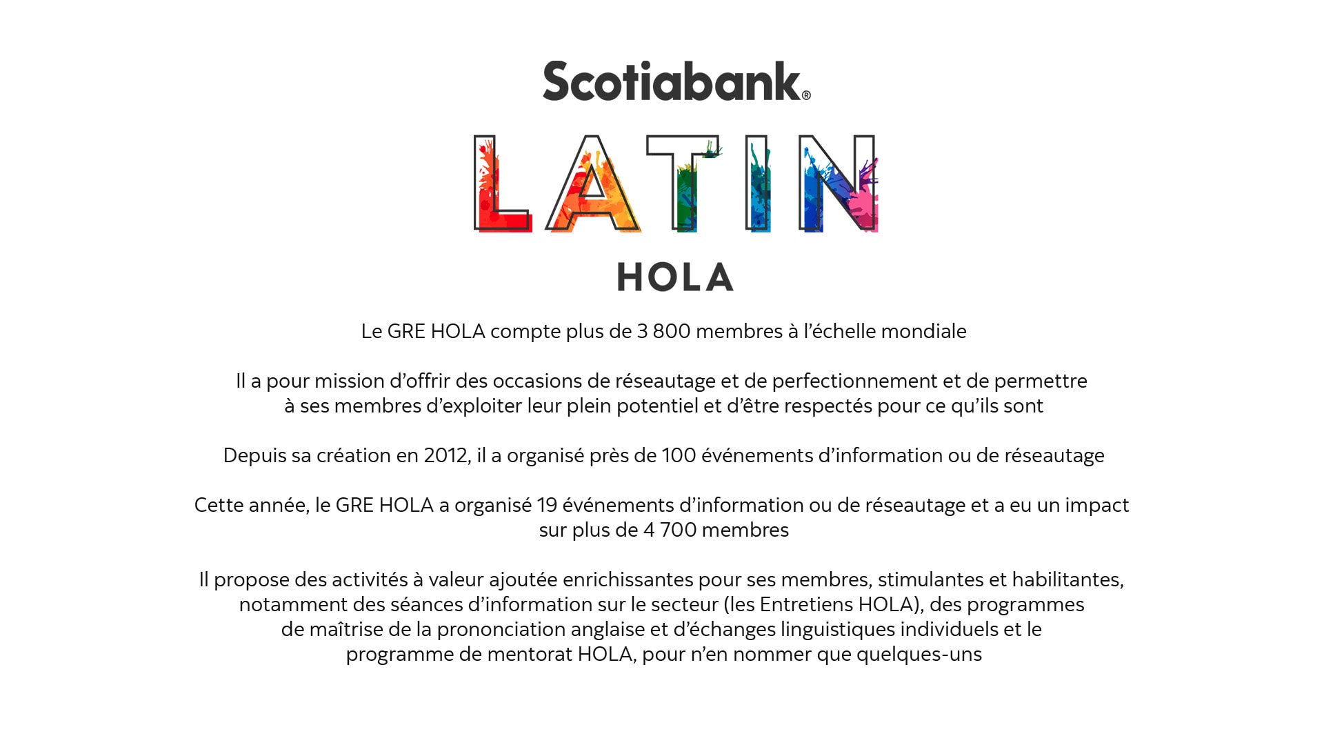 Diego : Le GRE HOLA est inscrit dans l’ADN de la Banque; il a été créé au Canada il y a plus de 10 ans pour représenter les intérêts de la communauté des employés hispaniques et latino-américains. Dans Workplace, le nombre de membres du Réseau latin (GRE HOLA) a presque doublé en un an, passant d’environ 2 000 à 3 800 membres; il s’agit du troisième GRE en importance quant au nombre de membres, après le GRE Femmes (4 500 membres) et le GRE LGBT+ (9 600 membres), avec un énorme potentiel d’expansion au Canada et dans les pays des Opérations internationales. En tant que chef de file du secteur bancaire dans les Amériques, la Banque s’est engagée à soutenir les communautés et les employés dans les pays que nous servons, et l’Amérique latine est parmi les endroits où la croissance et les activités de la Banque sont les plus importantes, et on y trouve un très grand bassin d’employés. Le GRE HOLA procure une plateforme mondiale pour le réseautage et le perfectionnement des compétences, par l’entremise de ses différents programmes, qui sont offerts non seulement aux employés hispaniques et latino-américains, mais aussi à tous les BanquiersScotia partout dans le monde qui souhaitent faire progresser leur carrière, leurs compétences et leur parcours professionnel à la Banque.