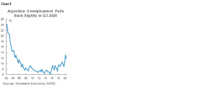 - On Thursday, December 17, INDEC followed up with Q3’s jobs numbers, wherein the unemployment rate pulled back a bit from 13.1% in Q2 to 11.7% (chart 4). We had expected Q3’s growth rebound to drive the unemployment rate down a bit further to 10.4%, but more people returned to the active labour force in the midst of the extended lockdown than we had expected, with a higher share of them accepting underemployed situations.