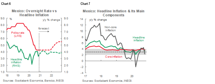 For now, we maintain our projection of a hold at the Board’s next monetary-policy meeting in February, but we caution that this is subject to a fundamental review of our forecasts in January. Banxico’s Survey of Expectations now finds that most analysts expect another -25 bps cut to 4.00% to be delivered by Q2-2021.