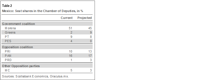 - Shifts in party membership after the 2018 election left Morena with 51% of seats in the Chamber of Deputies (see table 2, again), some 5 percentage points (ppts) more than the 45.8% share of votes that Morena garnered at the polls. A recent ruling by the Mexican electoral arbiter (Tribunal Electoral del Poder Judicial de la Federación) has put a limit on the extent to which newly-elected representatives can change parties after an election: such shifts in affiliation may not result in a deviation of more than 8 ppts between the share of votes a party received in an election and its share of seats in the Lower House. This ruling does not, however, prevent coalitions, whether formal or more casual, between the parties on a durable basis or on ad hoc issues.