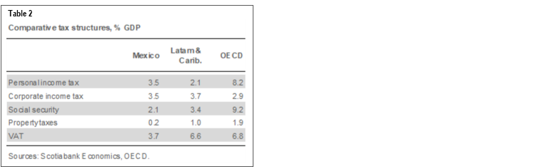 The debate on how to increase public revenues has already begun, but there are differing views on how to do it. Some suggest raising funds through improvements in tax collection under the current fiscal structure: the head of Servicio de Administración Tributaria (SAT), Raquel Buenrostro, as well as President López Obrador, both seem to support this idea. However, others, such as the Secretary of Finance, Arturo Herrera, favour a more ambitious tax reform. Some of the components of Mexico’s tax burden are already heavy relative to those of countries with which Mexico competes to attract investment (table 2)—even more so if we adjust the tax base for the high rate of informality in the country (around 50%), which means that those who pay taxes already shoulder big responsibilities.