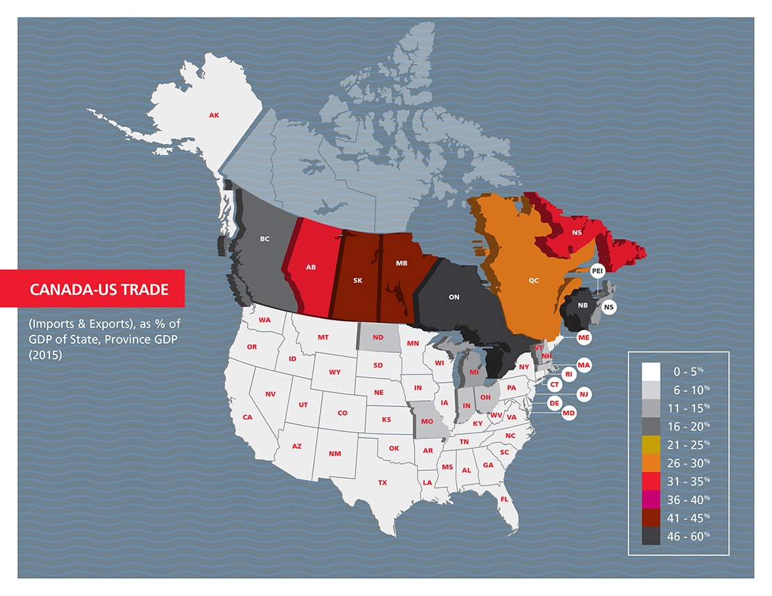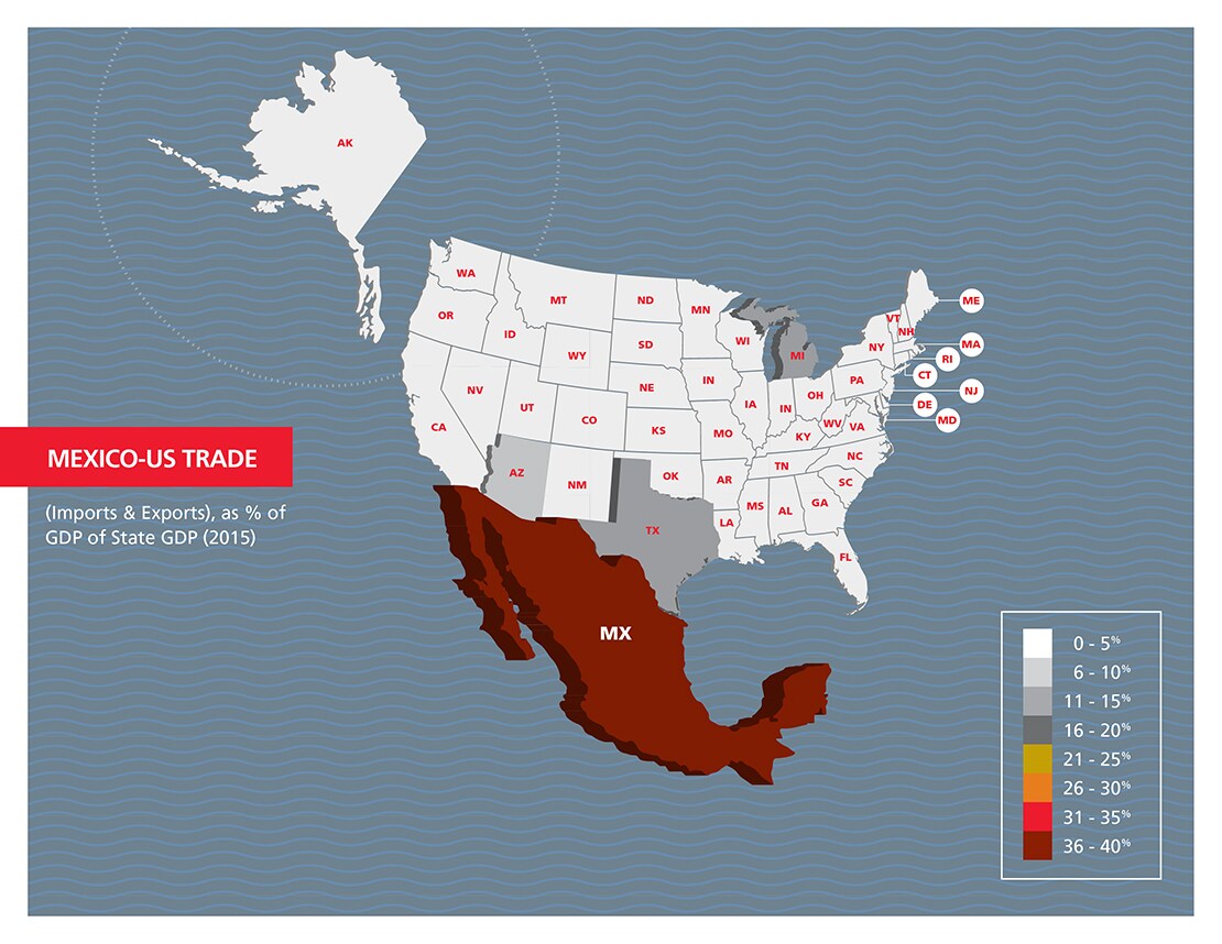 Trade in nearly every U.S. state and Canadian provincial economy is significantly impacted by NAFTA. Canada and Mexico are the top export destinations for 39 U.S. states and on the import side, the two countries together are the most important sources of in-bound foreign foods for 19 U.S. states.