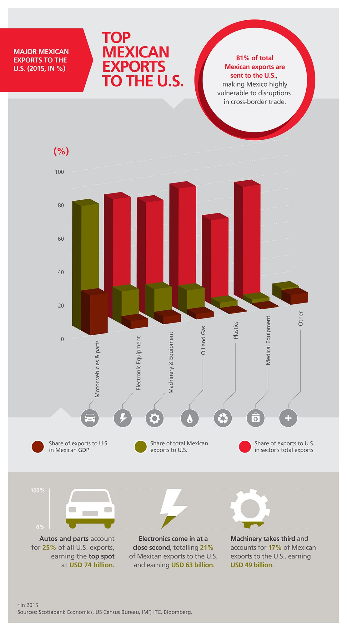 Substantial revisions to Mexico-U.S. trade policy and ‘tweaks’ in its agreement with Canada have been widely hinted at by the Trump Administration. In the face of uncertainty, Scotiabank Economics takes a look at what these tweaks could mean for the NAFTA member countries.