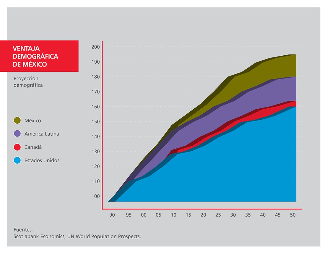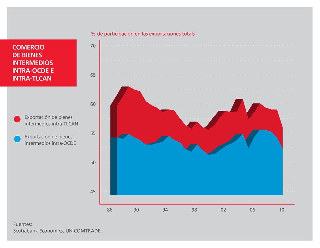 México mantiene competitivo el sector manufacturero norteamericano. Los bienes intermedios cruzan las fronteras de los tres países del TLCAN repetidas veces durante el proceso de fabricación. Esto significa que aproximadamente el 40% del contenido de las importaciones de México a Estados Unidos está realmente “Hecho en Estados Unidos”. Lo mismo sucede con las importaciones de Canadá, que tienen un 25% de contenido estadounidense. En conjunto, Canadá y México representan el 75% de todo el contenido nacional de Estados Unidos que regresa a Estados Unidos como importaciones procedentes de todo el mundo.