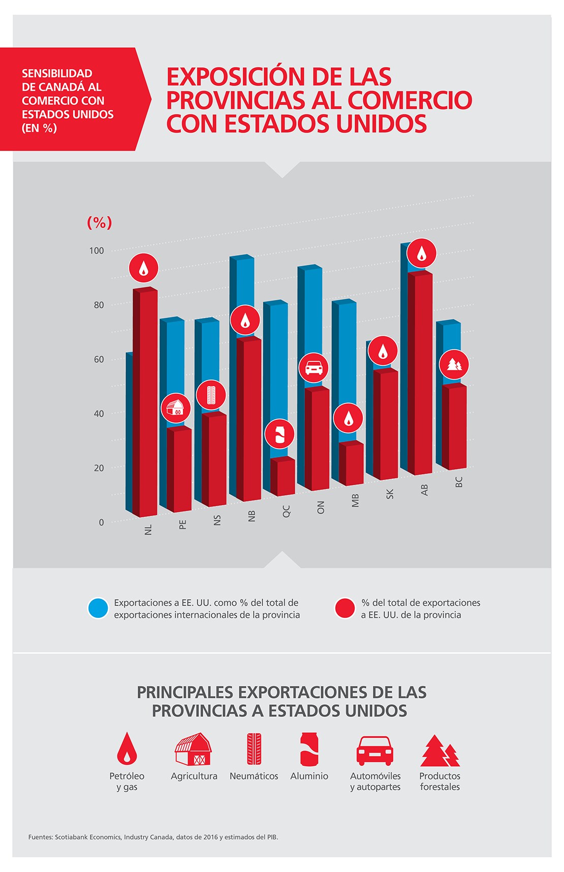 El sector manufacturero de Ontario está particularmente expuesto a los cambios en la política comercial de Estados Unidos. Las exportaciones del sector automotor de Ontario generan casi el 25% del ingreso anual de la provincia. Cualquier perturbación de las cadenas de suministros profundamente integradas con Estados Unidos sería perjudicial para la economía de Ontario.