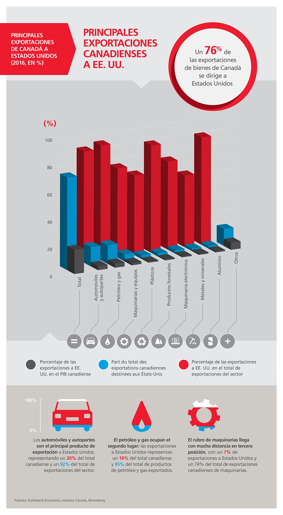 Aproximadamente el 20% del ingreso nacional de Canadá proviene del suministro de bienes y servicios al mercado estadounidense. Estados Unidos es el destino de casi el 76% del volumen anual total de exportaciones canadienses.