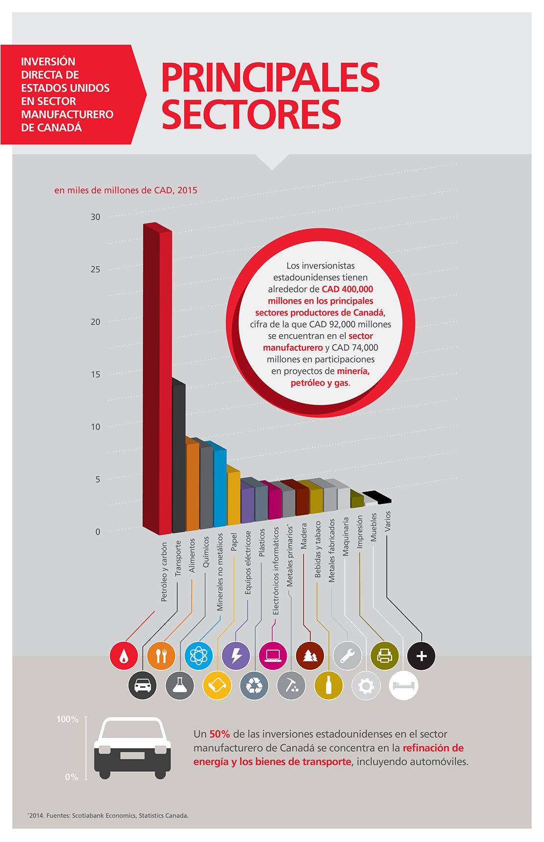 La inversión de Estados Unidos en los sectores de exportación canadienses puede también verse afectada Los inversionistas estadounidenses con un volumen importante de participaciones en los principales sectores de exportación de Canadá pueden convertirse en una especie de frente común dentro de Estados Unidos que ejercería presión contra toda perturbación del comercio entre los dos países, ya que ello podría tener un impacto significativo en sus negocios.