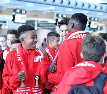 Des jeunes de l’équipe du Toronto FC s’amusent à l’aéroport avant leur départ pour le tournoi de la Ligue des champions CONCACAF de la Banque Scotia pour les moins de 13 ans.