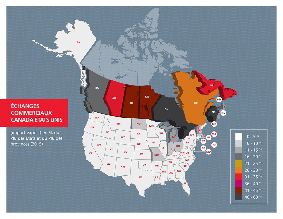 Dans presque tous les États américains et toutes les provinces canadiennes, le commerce est touché considérablement par l’ALÉNA. Le Canada et le Mexique sont les premières destinations exportatrices pour 39 États américains. Du point de vue des importations, ces deux pays représentent ensemble les plus grands fournisseurs de biens étrangers importés pour 19 États américains.