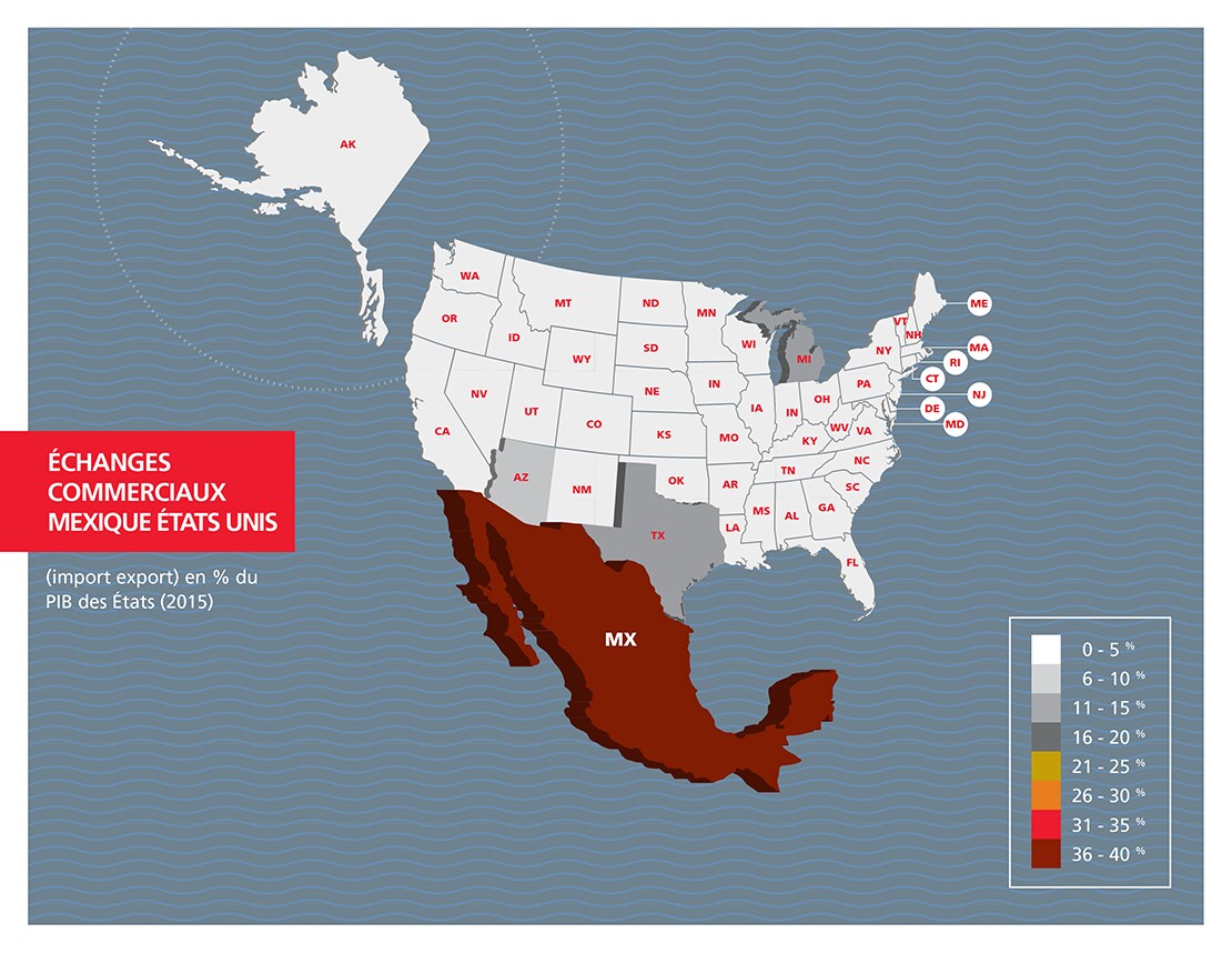 L’économie américaine dépend moins directement du commerce international que l’économie canadienne ou l’économie mexicaine. Or, les économies de plusieurs États limitrophes des États Unis sont intimement liées aux échanges commerciaux dans le cadre de l’ALÉNA, en raison d’une intégration économique plus étroite.