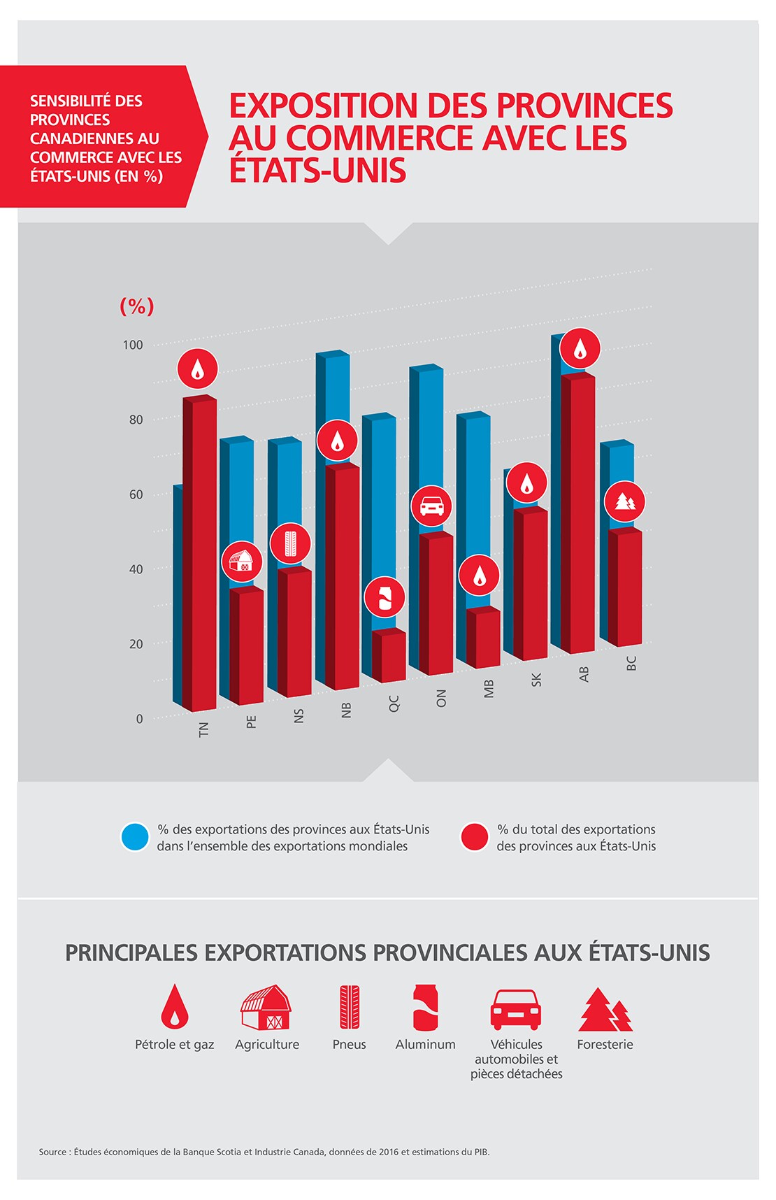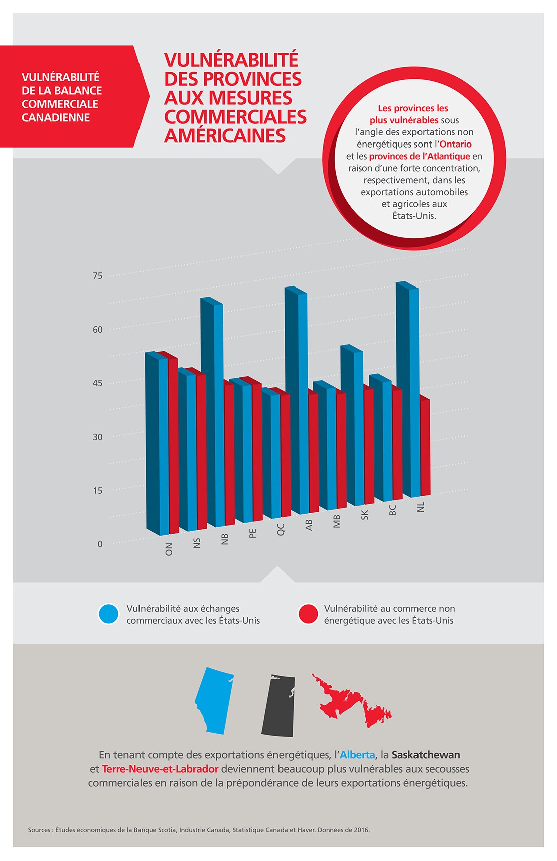 Le secteur manufacturier de l’Ontario est particulièrement vulnérable aux changements qui pourraient être apportés à la politique commerciale américaine. Les exportations du secteur automobile ontarien représentent environ 25 % du produit annuel de cette province. La perturbation des chaînes d’approvisionnement intégrées avec les États Unis nuirait à l’économie de l’Ontario.