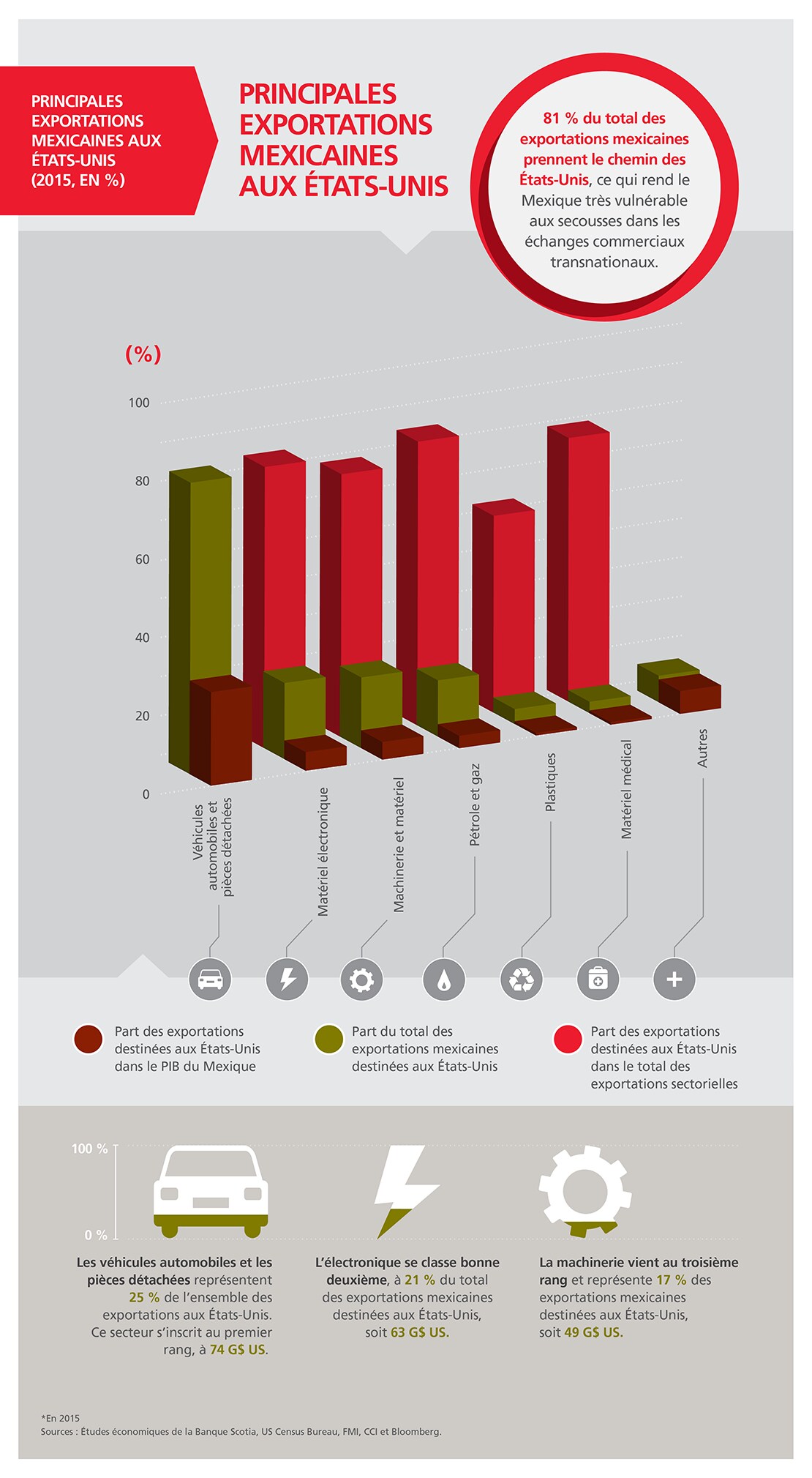 Les échanges commerciaux entre le Mexique et les États Unis subiraient aussi un choc comparable à celui du Canada, puisque le Mexique est le troisième fournisseur de biens des États Unis.