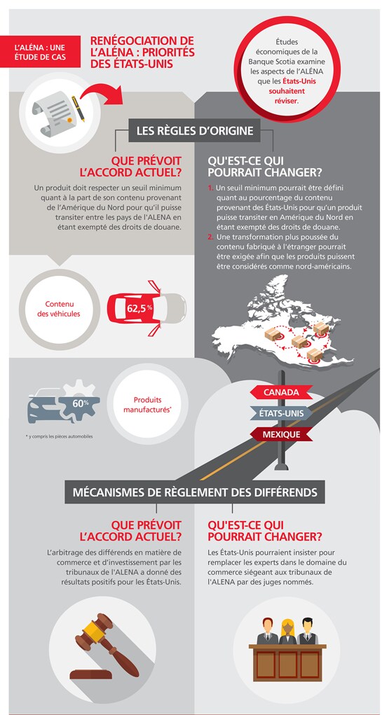 L’administration Trump ne s’est pas gênée pour dire qu’elle apporterait d’importantes révisions à sa politique sur les échanges commerciaux entre le Mexique et les États Unis et qu’elle « mettrait au point » son pacte avec le Canada. Dans ce climat d’incertitude, les Études économiques de la Banque Scotia posent un regard sur ce que ces mises au point pourraient représenter pour les pays membres de l’ALÉNA.